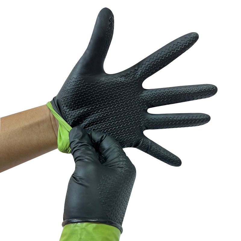 Guante Reutilizable de alta calidad en nitrilo con acabado zag en color negro e interior verde. Doblemente reforzado con aviso de rotura. 30% más agarre que un guante diamantado.