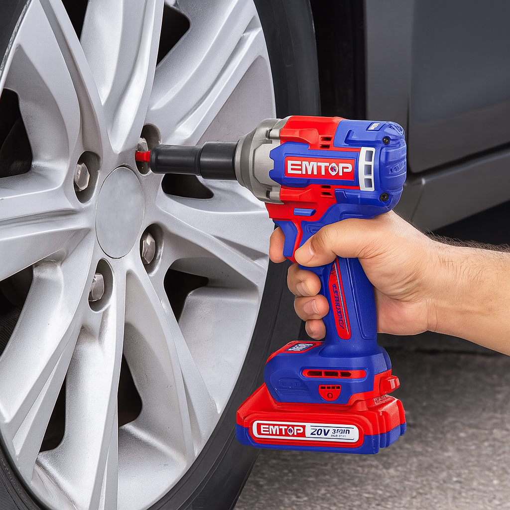 La pistola de impacto inalámbrica Emtop ECIWL2040, es un tipo de herramienta de mano portátil que emplea la energía de una batería recargable para generar torque y aflojar o aproximar pernos y tuercas.