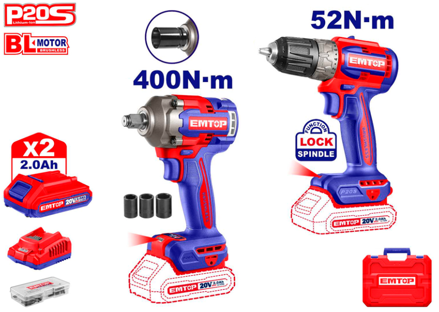 El kit de taladro de mano + amoladora Emtop, permiten perforar diferentes materiales y con la pistola de impacto podrás