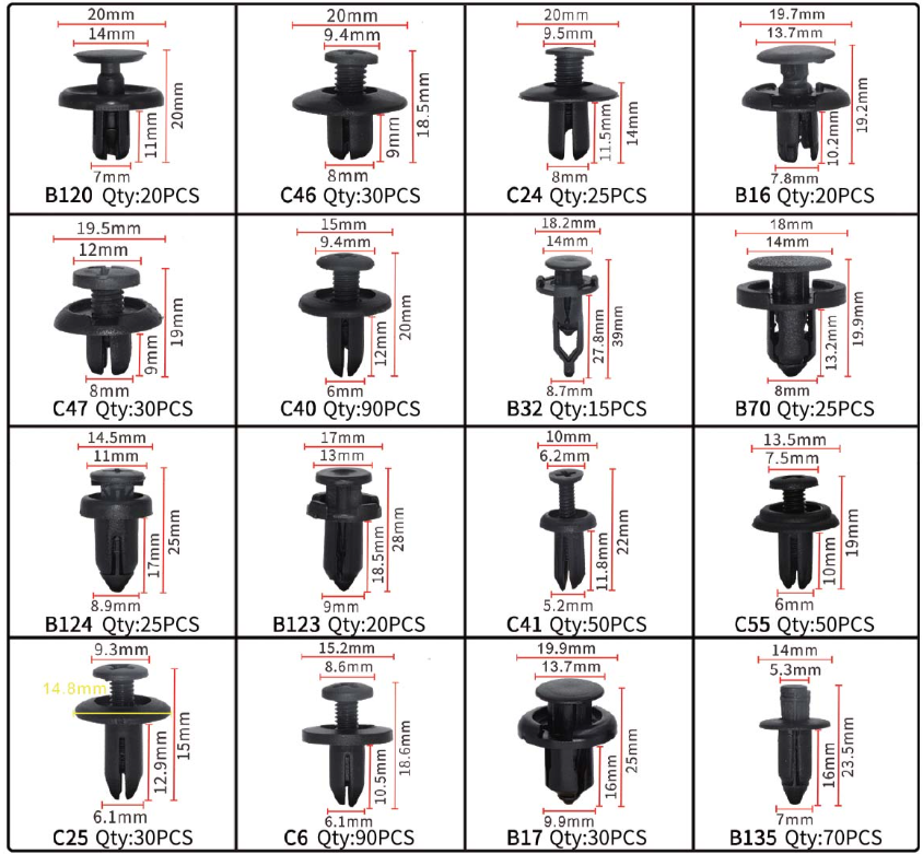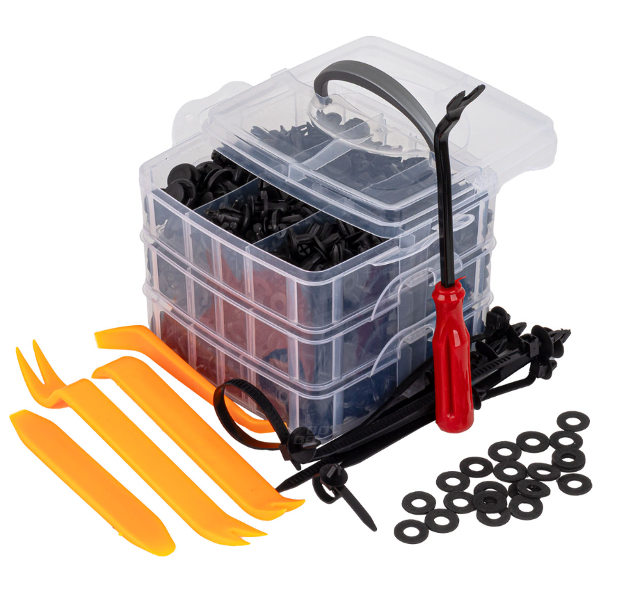 Juego de elementos de fijación universales, clips, pasadores y herramientas para su desmontaje, con un total de 650 piezas. Fabricados en PVC de alta calidad, garantizan durabilidad y resistencia a los daños.