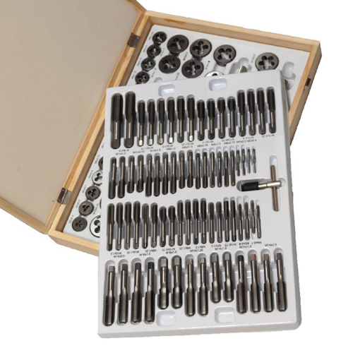 Rosca métrica ISO. Acero al Cromo. 1 Giramachos tipo T. 2 Giramachos: 1 M6 – M20; 1 M3-M12. 2 Portafileras: 1 ø25,4; 1 ø38,1. 70 machos (juegos de 2 piezas) y 35 fileras.