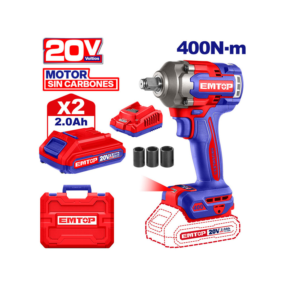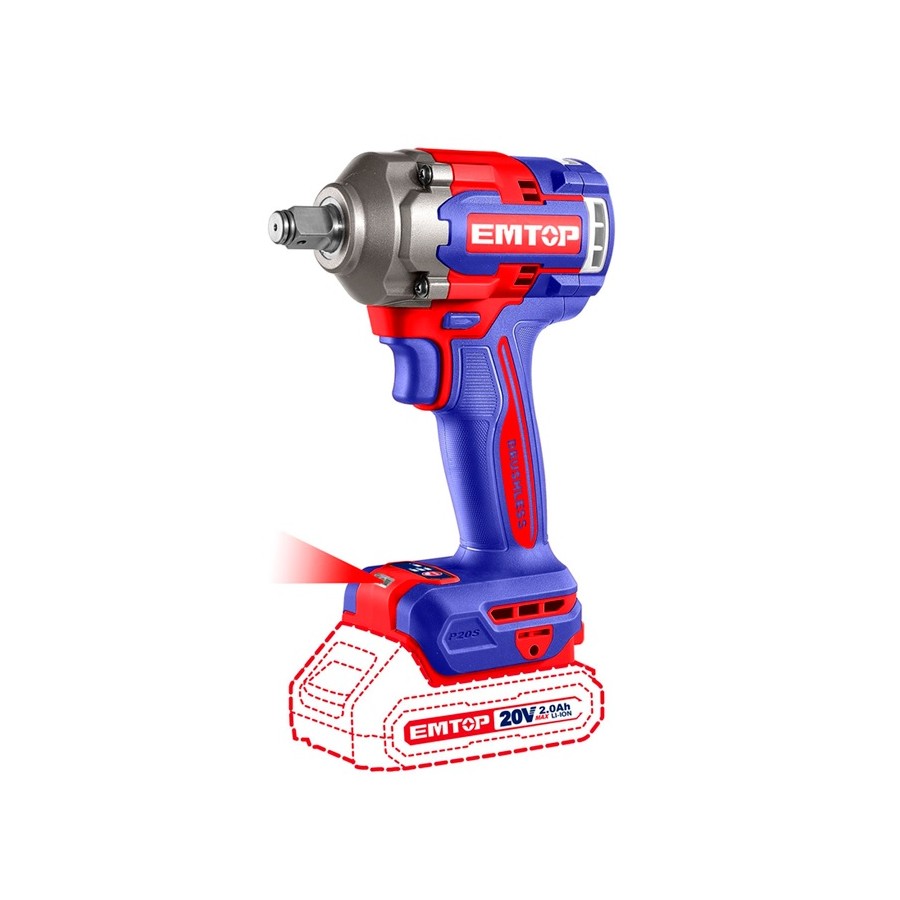 La pistola de impacto inalámbrica Emtop ECIWL2040, es un tipo de herramienta de mano portátil que emplea la energía de una batería recargable para generar torque y aflojar o aproximar pernos y tuercas.