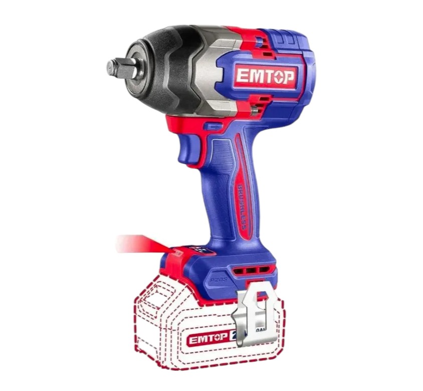 La pistola de impacto inalámbrica Emtop ECIWL2085, es un tipo de herramienta de mano portátil que emplea la energía de una batería recargable para generar torque y aflojar o aproximar pernos y tuercas.