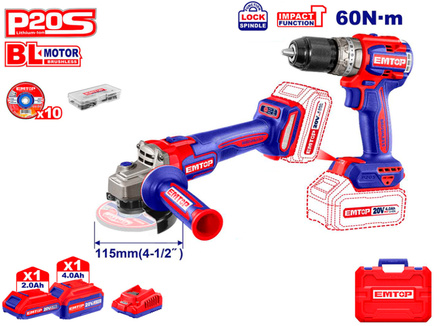 El kit de taladro de mano + amoladora Emtop, permiten perforar diferentes materiales y con las amoladoras podrás lijar, pulir o cortar diferentes materiales. Por tanto te permite realizar diferentes tareas de bricolaje en las que se incluyan ambas tareas. Es una gran opción para tener en el taller o garage. Este kit incluye un taladro, una amoladora, 2 baterías (1/2Ah - 1/4Ah) para poder utilizar en cualquiera de las dos herramientas (ya que son compatibles), un cargador de carga rápida para no perder tiempo durante el trabajo, 10 discos de cort, juego de puntas para taladro y maletín para poder transportar y almacenar de forma segura y cómoda este kit.