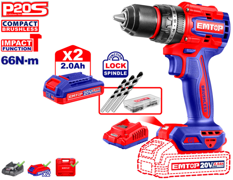 El taladro percutor Emtop ECIDL20668 es una herramienta eléctrica a batería cuyo uso principal, en sus inicios, es realizar perforaciones en cualquier tipo de material. Con los avance de las nuevas tecnologías, el taladro se ha convertido en una herramienta que, acoplando una serie de elementos, te permite lijar, atornillar o afilar.