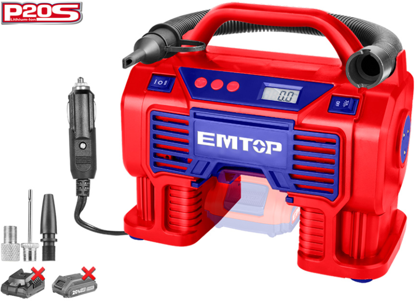 Los mini compresores de aire Emtop ELAC2002, también denominados compresores de aire portátiles, se caracterizan principalmente por sus diseños compactos y dimensiones pequeñas; unas cualidades que lo hacen fácil de transportar a cualquier lugar que necesita el operario. Posibilidad de conectar al encendedor del coche.