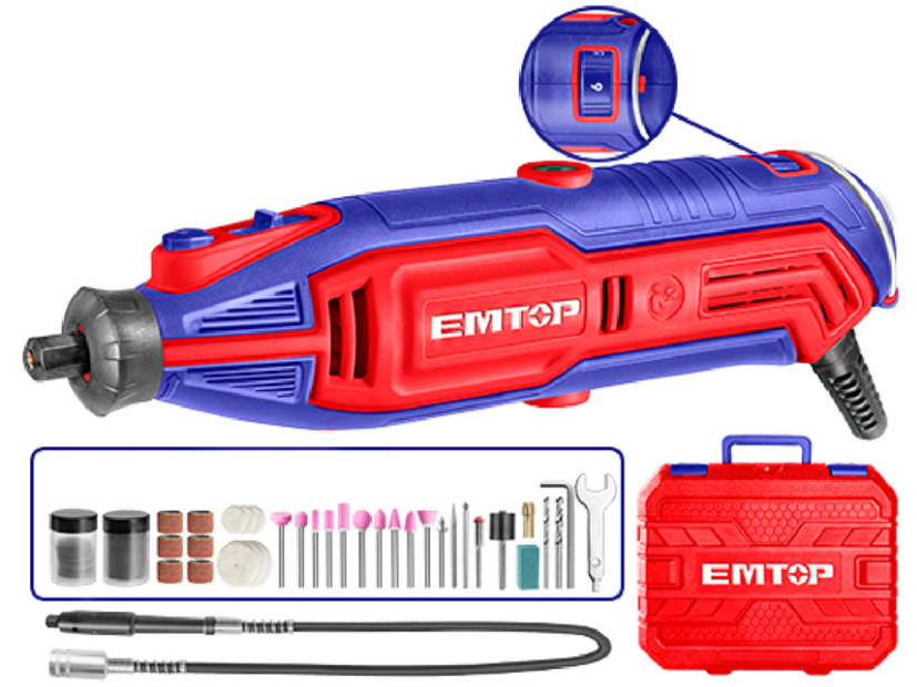 La mini amoladora Emtop EMGK1301, es una pequeña herramienta eléctrica que se usa para amolar, lijar, bruñir y pulir diversos materiales.