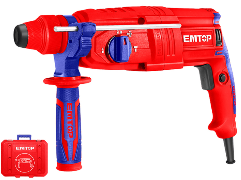 El taladro percutor Emtop ERHRL801, es el tipo de taladro que se caracteriza por disponer de función de percutor, que consiste en que la broca del taladro no solo rota sobre si misma, sino que además realiza un pequeño movimiento hacia adelante y hacia atrás con el objetivo de romper el material y facilitar el taladrado. Incluye: 3 brocas, 2 cinceles y maletín de transporte.