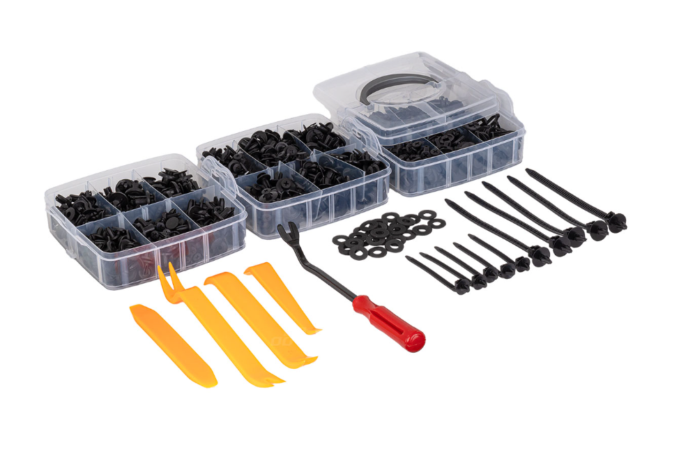 Juego de elementos de fijación universales, clips, pasadores y herramientas para su desmontaje, con un total de 650 piezas. Fabricados en PVC de alta calidad, garantizan durabilidad y resistencia a los daños.