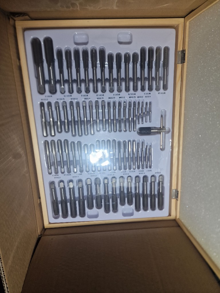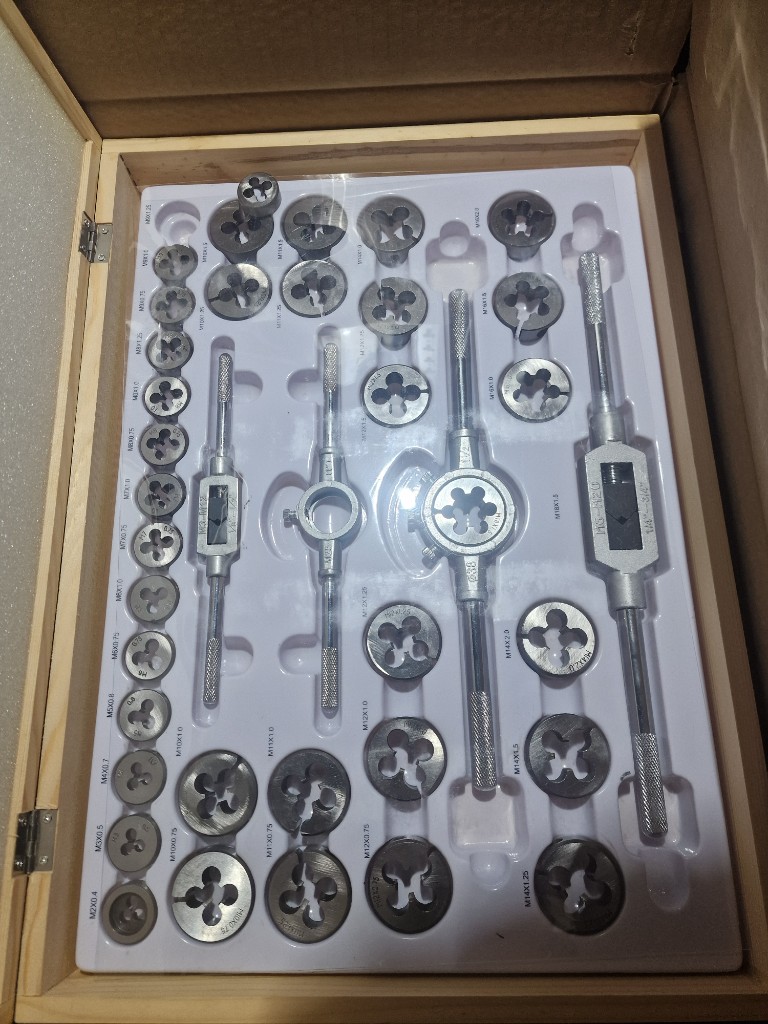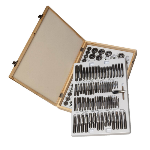 Rosca métrica ISO. Acero al Cromo. 1 Giramachos tipo T. 2 Giramachos: 1 M6 – M20; 1 M3-M12. 2 Portafileras: 1 ø25,4; 1 ø38,1. 70 machos (juegos de 2 piezas) y 35 fileras.